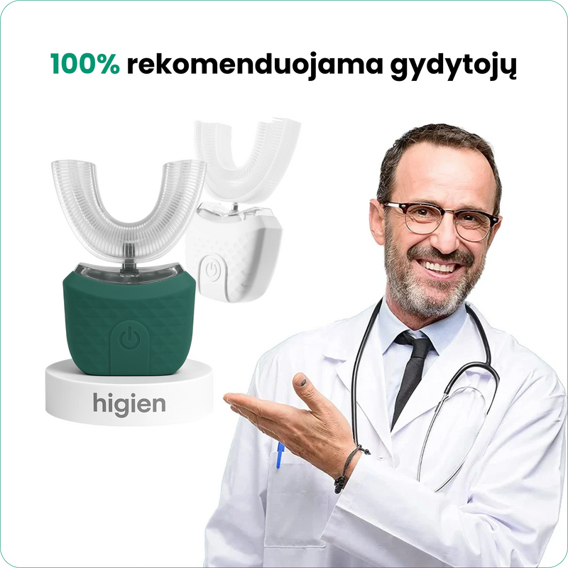 Higien™ tai išmanus dantų šepetėlis su pažangia ultragarso vibracijų technologija, leidžiančia efektyviai pašalinti apnašas ir masažuoti dantenas vos per 30 sekundžių. Jo minkšti, antibakteriniai šereliai prisitaiko prie dantų formos, užtikrindami švelnų, bet giliai išvalantį poveikį.