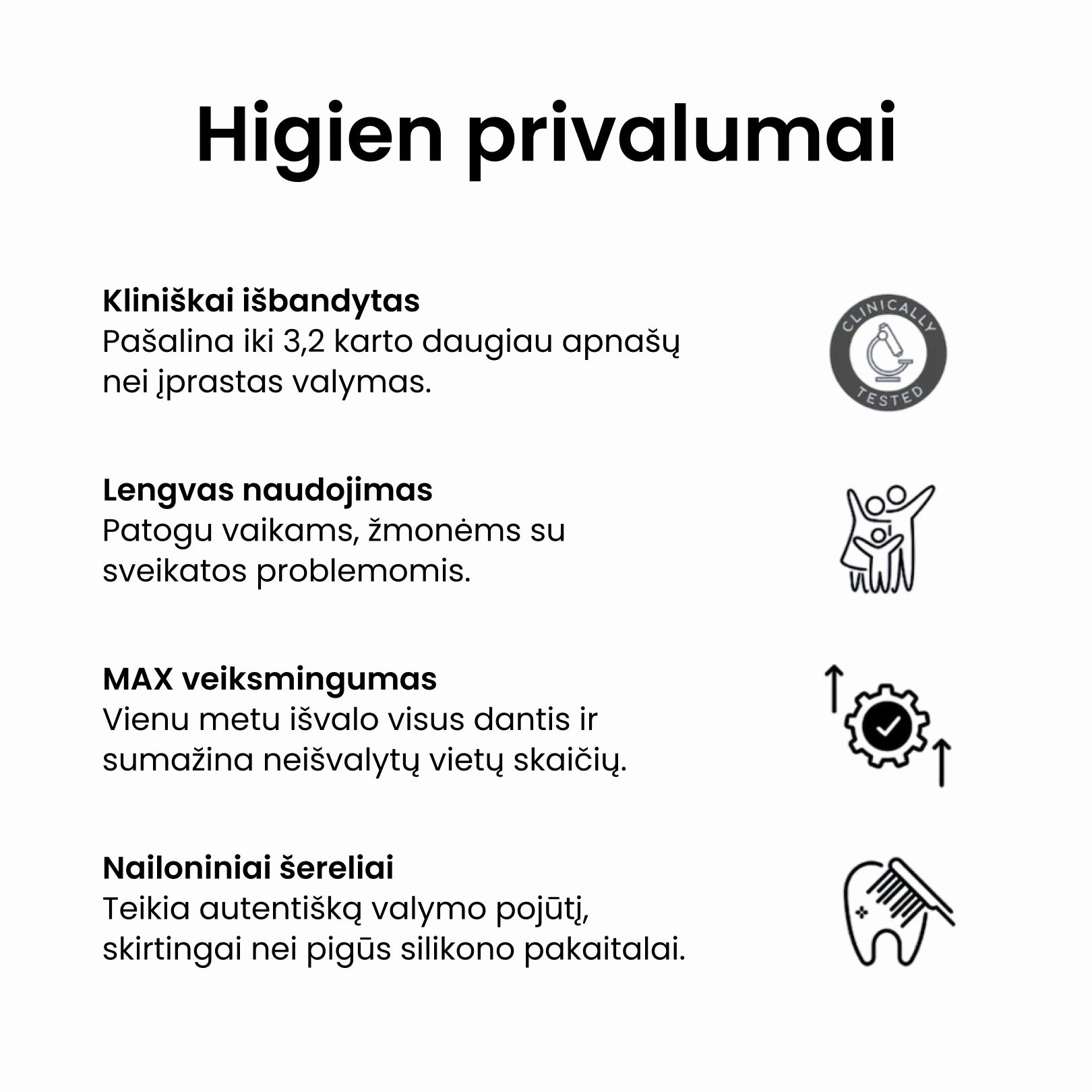 Mūsų šepetėlio galvutė pagaminta iš aukšto tankio nailono be silikono, todėl valydamiesi jausitės lyg su įprastu dantų šepetėliu – tačiau dantys bus išvalyti greičiau ir švariau. Skirtingai nei įprasti U formos šepetėliai, šis dizainas su nailoniniais šereliais pasiekia sunkiai prieinamas vietas ir tolygiai jas nuvalo vos per 30 sekundžių.